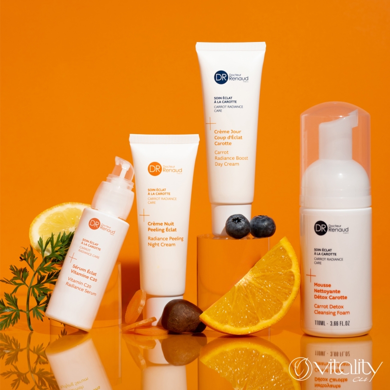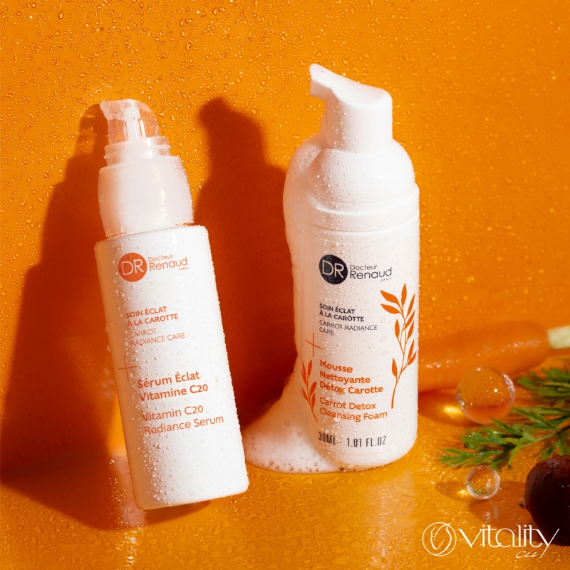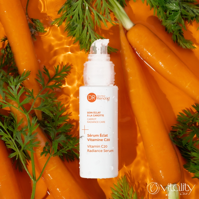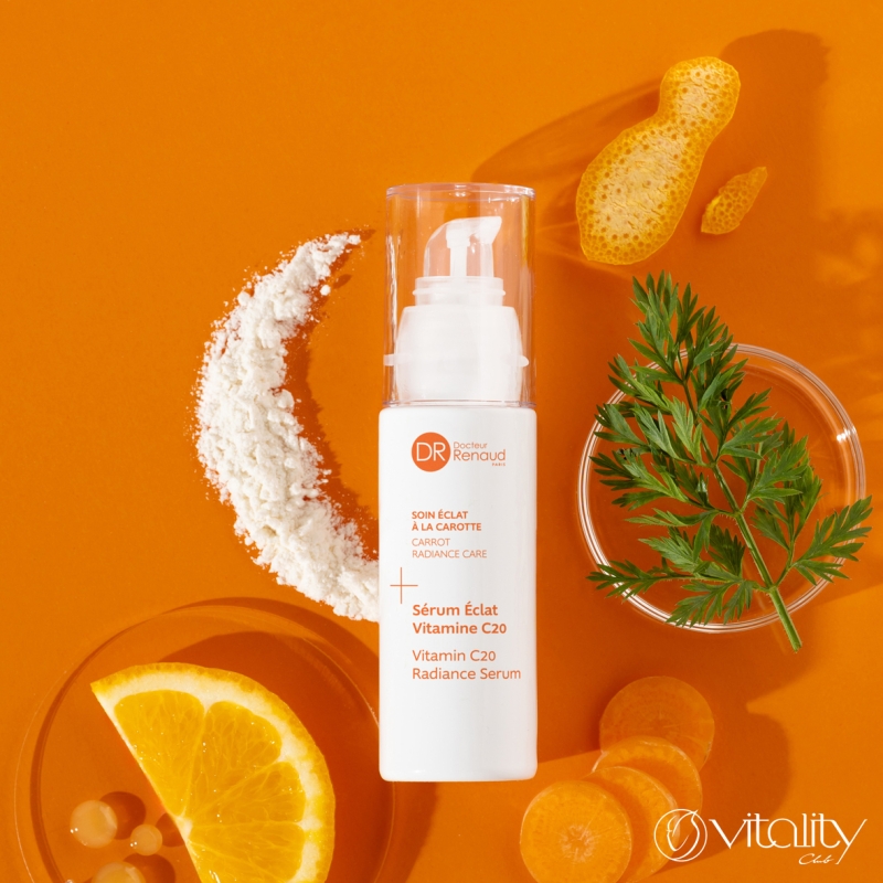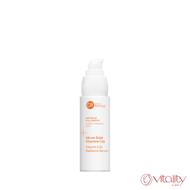 Серумът перфектно съчетава 20% стабилизиран витамин С, хиалуронова киселина и органичен екстракт от морков. Действа като истински стимулатор за уморена и повяхнала кожа. Моментално и видимо подобрява еластичността, хидратацията и стегнатостта на кожата, усъвършенства нейната текстура, осигурява здравослен, сияен и равномерен тен, спомага за намаляване на пигментните петна. Витамин C е мощен антиоксидант, който изсветлява кожата и стимулира производството на колаген. В комбинация с органичен екстракт от морков и детоксикиращи дрожди от черен и бял трюфел регенерират, изглаждат кожния релеф, подобряват блясъка и равномерността на тена. Хиалуроновата киселина осигурява интензивна и дълготрайна хидратация, изпълва кожата отвътре и изглажда бръчките. Патентованият фитокислороден комплекс на Dr Renaud (наносфери с витамини C и Е и екстракт от витекс) подобрява снабдяването на клетките с кислород, защитава от външни агресии, релаксира и придава сияйност на кожата.